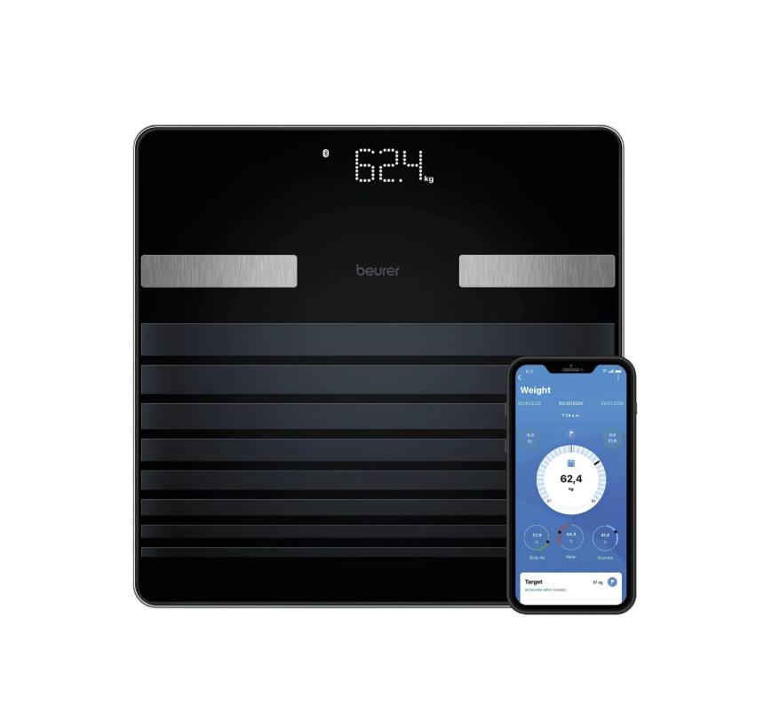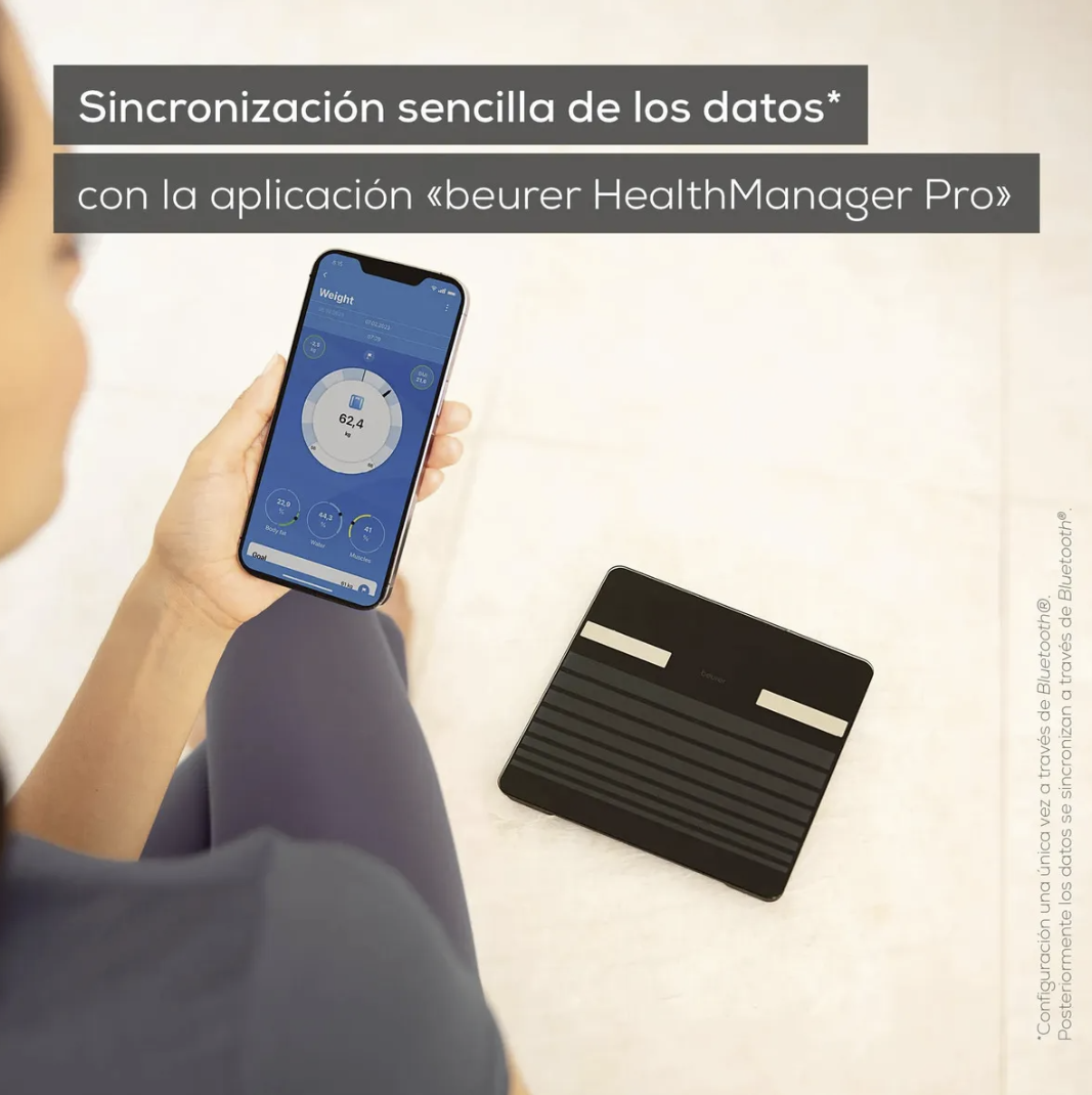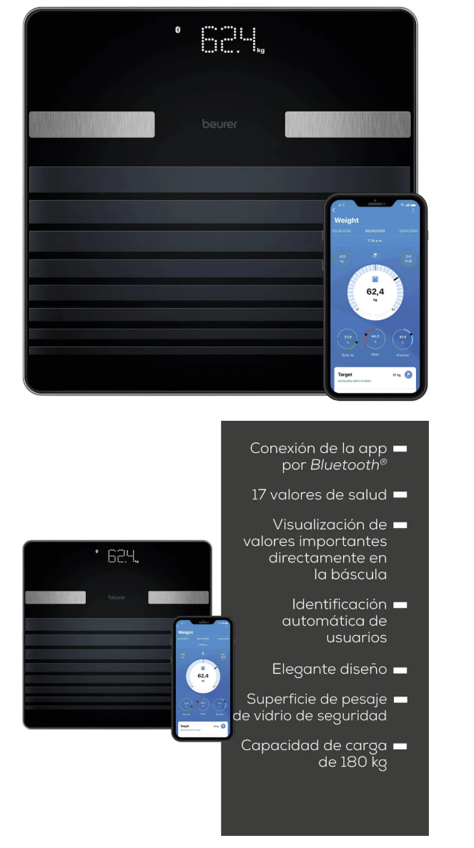 La báscula diagnóstica Beurer BF 451 combina un análisis corporal preciso y un diseño elegante con una estructura de azulejos mate. El peso, la grasa corporal, el IMC, así como el porcentaje de agua y músculo se muestran directamente en la pantalla; además, los datos se pueden transferir de forma rápida y sencilla a la aplicación «beurer HealthManager Pro» a través de Bluetooth®. Con 8 memorias de usuario y reconocimiento automático de usuario, es ideal para el uso diario, incluso en hogares grandes. – Visualización de los valores de salud importantes directamente en la báscula (peso, IMC, grasa corporal, agua corporal, porcentaje de músculo esquelético). – 17 Valores de salud siempre a la vista. – Superficie elegante con estructura de líneas mate. – Electrodos de acero inoxidable cepillado. – Superficie de pesaje de cristal de seguridad. – LED mágico: la pantalla sólo aparece durante la medición. – Aplicación gratuita «beurer HealthManager Pro». – Práctica función de desconexión. – Moderno aspecto de matriz de puntos. – Alta capacidad de carga de 180 kg como máximo – Indicador de sobrecarga si se sobrepasa la capacidad de carga máxima. – Práctico encendido automático: subir y ponerse en marcha. – Superficie del escalón de cristal de seguridad de 6 mm de grosor. carga máxima. – Práctico encendido automático: subir y ponerse en marcha. – Superficie del escalón de cristal de seguridad de 6 mm de grosor.