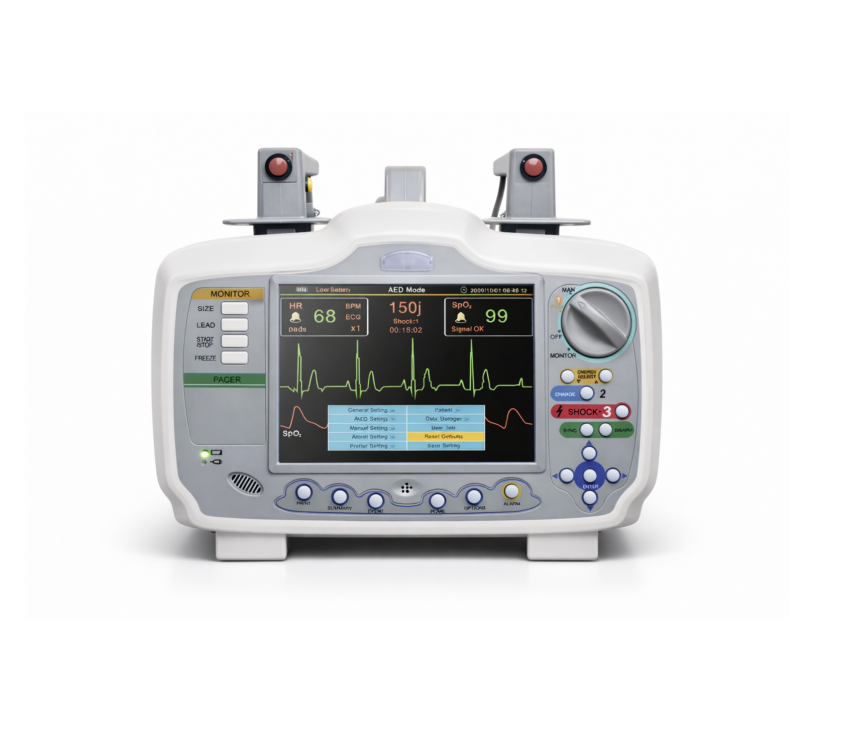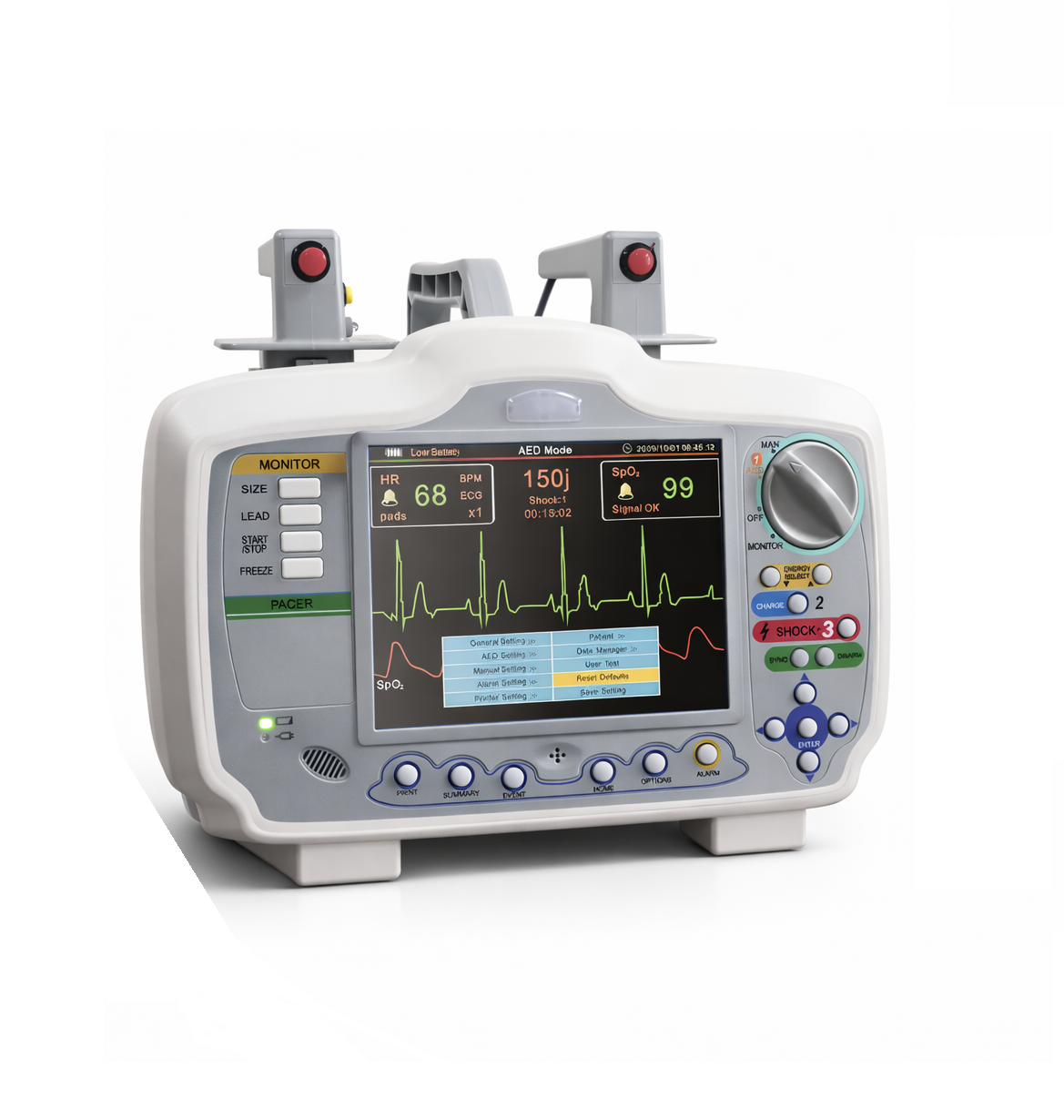 Desfibrilador ligero y duradero que integra monitorización, desfibrilación manual, DEA y marcapasos externo. Es un desfibrilador-monitor bifásico profesional adecuado para hospitales y clínicas, con monitorización para pacientes niños y adultos.