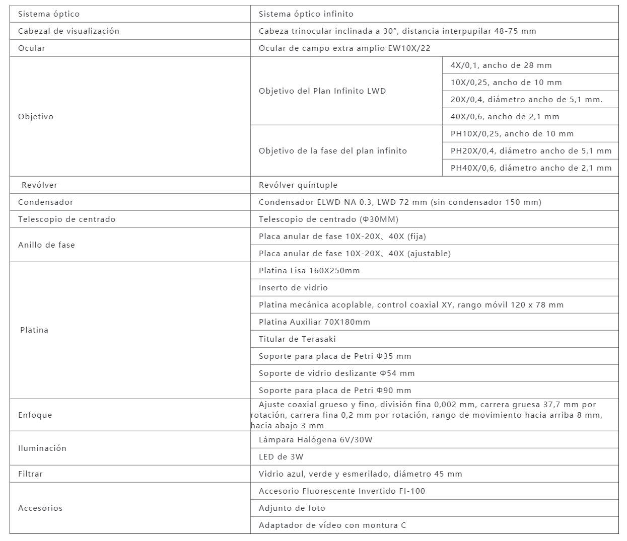 Tipo objetivo elegido, anillo de fase, tipo de platina seleccionada, iluminación requerida y accesorios fluorescente o de video con montura y foto (precio incluye 1 tipo de cada item):