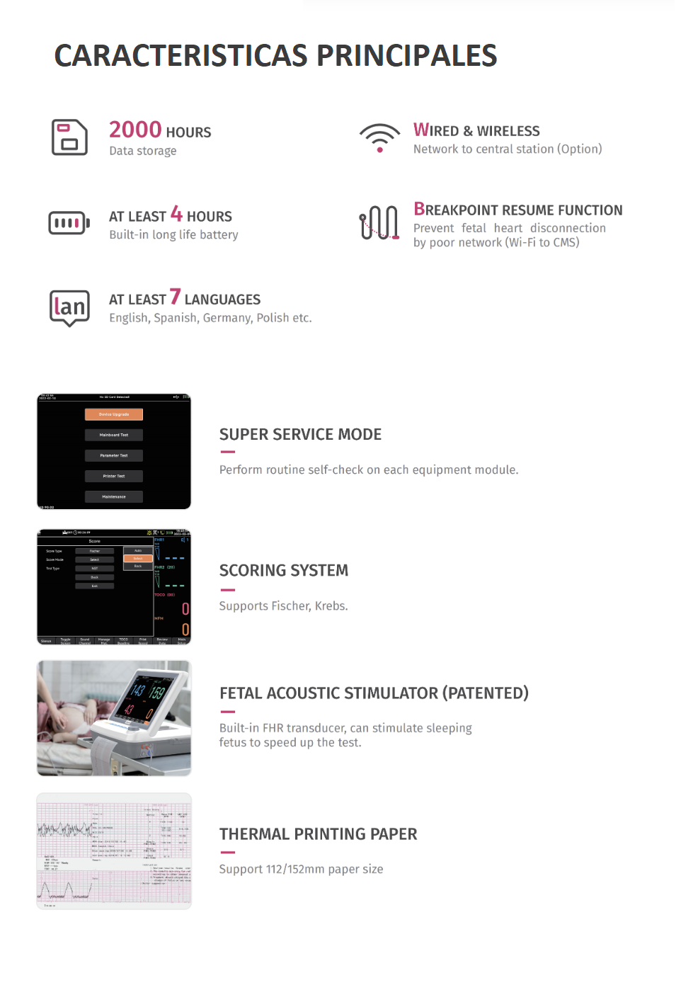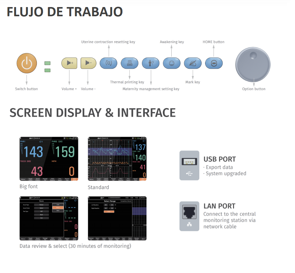 Monitor Materno Fetal Multiparámetro Jumper 600P con sistema de análisis de 6 parámetros para la madre y feto: FHR1, FHR2, TOCO, FM (Monitoreo Fetal), SPO2 (Saturación de Oxígeno) , NIBP (Presión Arterial no Invasiva).