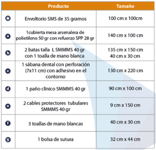 Producto desechable para ser utilizado en procedimientos quirúrgicos dentales y maxilofaciales, este pack fue especialmente diseñado para prevenir el riesgo de infección asociada a la salud bucal y maxilar. Sus 5 capas confieren la impermeabilidad y seguridad exigido por el personal médico. Posee 11 piezas: 1 cubierta mesa arsenalera reforzada, 2 delantales talla L con una toalla mano, 1 sábana dental, 1 paño clínico, 2 cables protectores tubulares, 3 toallas de mano y una bolsa de sutura.