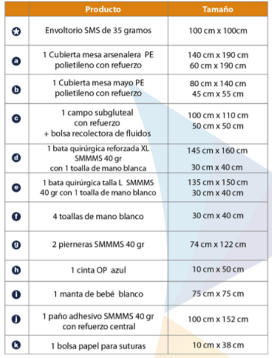 Nuestro paquete contiene 10 piezas: Envoltorio, Cubierta mesa arsenalera con refuerzo, cubierta mesa mayo con refuerzo, 1 campo subgluteal reforzado con bolsa recolectora de fluidos, 1 bata quirúrgica reforzada talla XL SMMMS con toalla de mano, 1 bata quirúrgica estándar talla L SMMMS con toalla de mano, 4 toallas de mano, 2 pierneras, 1 cinta OP, 1 manta de bebé y 1 paño adhesivo con refuerzo.