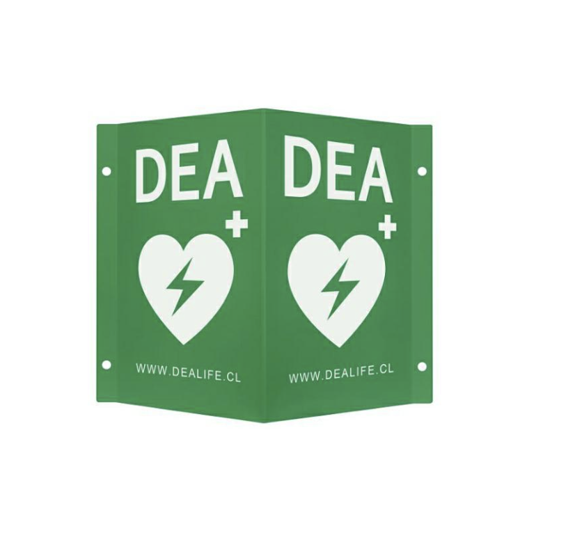 - Símbolos Universales y Texto Clarificador: Incluye símbolos reconocibles internacionalmente y texto claro que indican la presencia de un DEA, brindando información vital incluso en situaciones de estrés.