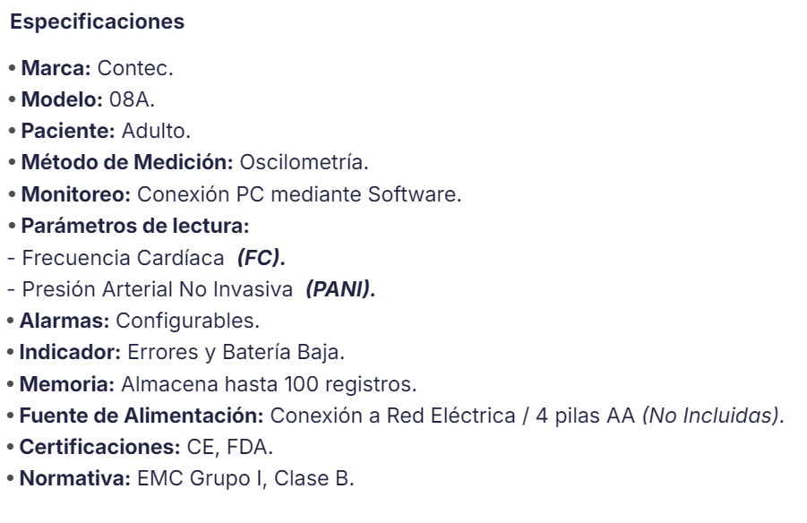 El Monitor De Signos Vitales Contec 08A , es un esfigmomanómetro electrónico que mide la frecuencia cardíaca, la saturación y la presión arterial, con función de medición de SpO2 (con sensor de SpO2 solo en opcional). Diseñado con interfaz de gran visibilidad, pantalla LCD de alta definición en color, el esfigmomanómetro portátil arroja resultados con exactitud confiable y clínicamente aprobado por la FDA. Además, las fuentes de poder pueden ser con pilas AA o la red eléctrica. Finalmente, el monitor de signos vitales incluye software para computadora para registrar la lista de datos y gráfica de pacientes para control médico.